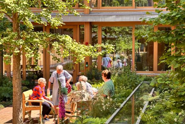 My favourite aspect of the scheme is the Garden Court, enclosed by the warmth of the oak frame and generous windows, and linking directly to the double-height indoor Garden Room. The changing colours, textures, sounds and light of the seasonal garden are brought into the residents’ everyday experience. The acoustics of the Court, coupled with the sound of the water feature, create a sanctuary space for socialising and relaxing in peace and quiet.