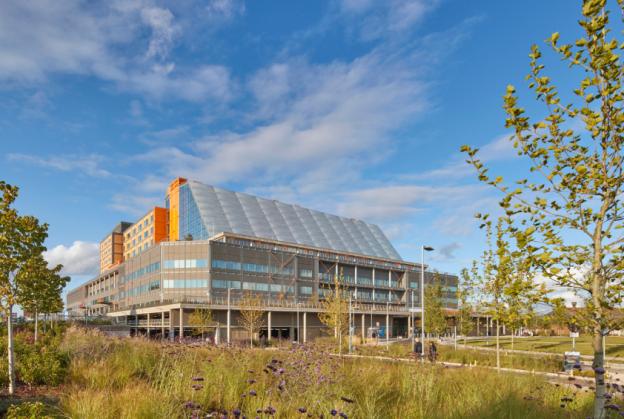 The boundary landscape and roof terraces incorporate a narrative on the adjacent canal-side and important habitats and species. The wards and internal circulation arrangements allowed for views onto landscaped courtyards, terraces and extensive roof gardens, and, in doing so, supported a strong inside/outside relationship. Importantly, this visually connects this large building to its natural surroundings. Landscape strategies include promoting active, healthy lifestyles, encouraging biodiversity, and creating spaces that are welcoming, inclusive, and therapeutic.