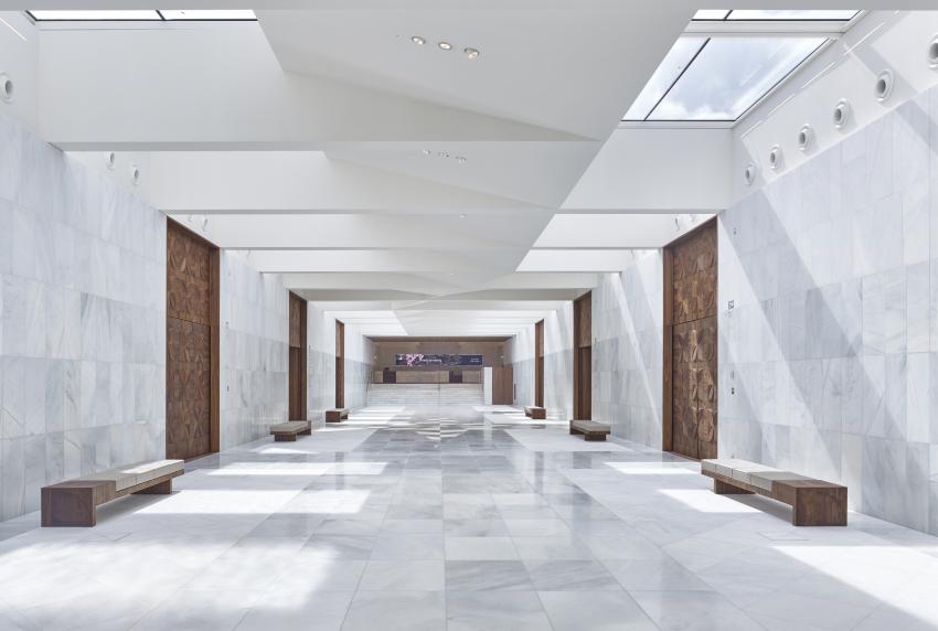 The finishes in the new building are designed to be elegant and restrained, with harmoniously blended textures and materials. Walnut wood, marble with alternating sandblasted, honed, and polished surfaces, and opulent fabrics with metallic threads are used throughout, referencing the gardens and ornate halls of the original palace.