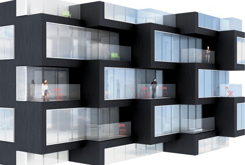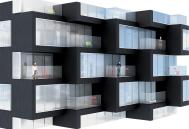 The texture of the façade evolves from a smooth glass façade enclosing the work space to a three-dimensional composition of apartments and balconies. The resultant silhouette expresses the unification of the two programs in a single gesture – in rational straight lines composed to form a feminine figure.