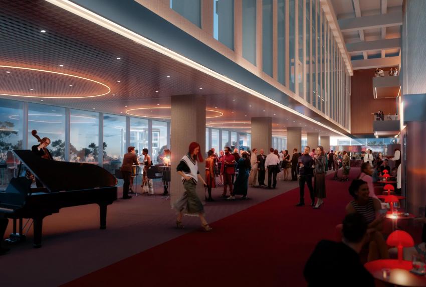 Direct access will be introduced to the level two lobby from the north and south, while the original northern plaza will be transformed into a landscaped public forecourt. A “red carpet” - made from recycled brick paving and referencing the hall’s carpet in the foyer - will lead patrons and visitors inside. The lobby will accommodate upgraded food and beverage offerings, with the southern section extended into a terrace overlooking the river. The original level one and level two lobbies will be refurbished, including the preservation of the distinctive red carpet, while the level one lobby will be transformed into a generous foyer serving as a musicians’ lounge and patron event space.