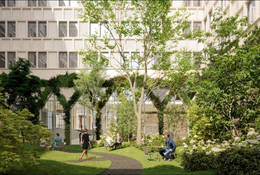 At its heart, the open garden and light-filled atria create a restorative environment that brings nature back into the daily life of residents and users. A high-end working environment is established by the introduction of a new green inner courtyard, which lets daylight into the offices, provides views, and creates attractive break-out space.